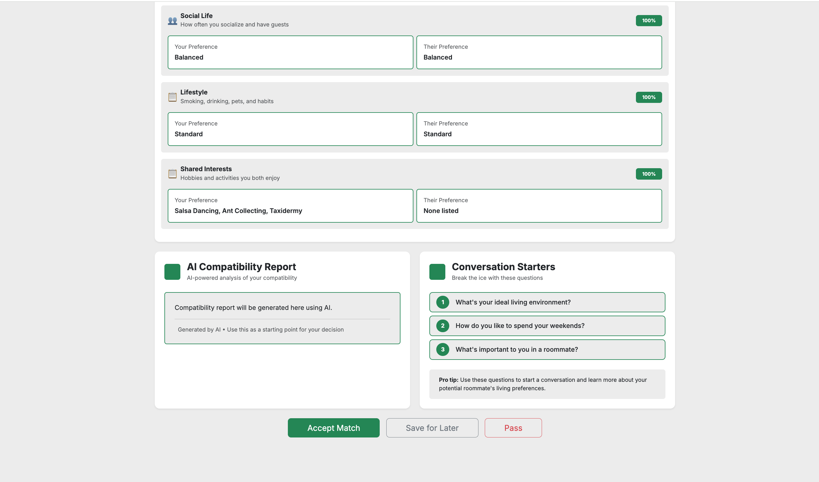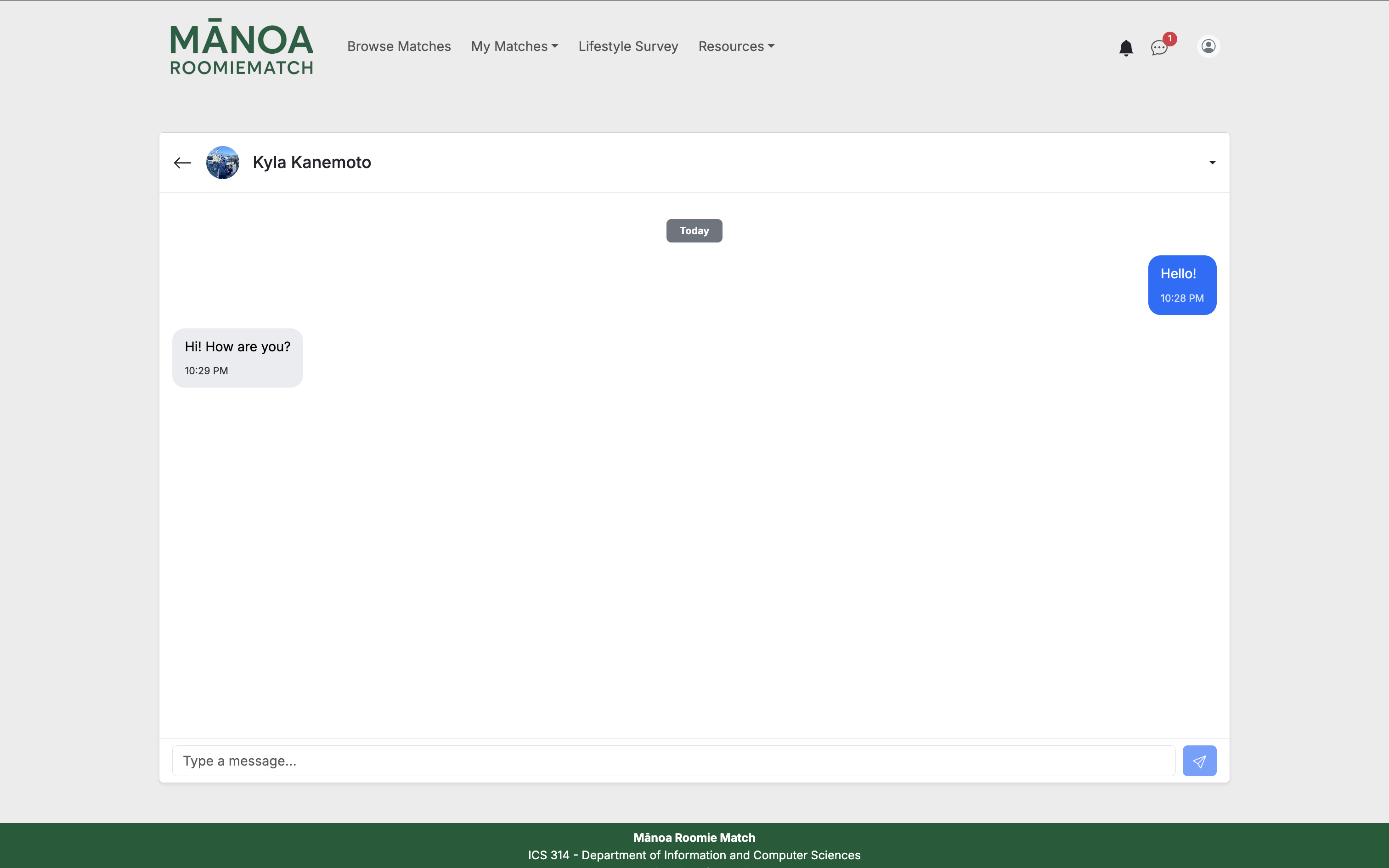 Manoa RoomieMatch is a web application that provides students at the University of Hawaii with AI-enhanced roommate matching. Students create an account using their UH email and fill out a lifestyle survey, covering sleep habits, cleanliness, and other aspects of roommate living. The application then compares user profiles to generate a compatibility score, along with an AI-generated explanation describing areas of alignment and potential conflict. These students can browse matches, view detailed comparisons, and connect with peers they’re compatible with. Progress was measured via “milestones,” where each milestone was a new or updated iteration of the web application